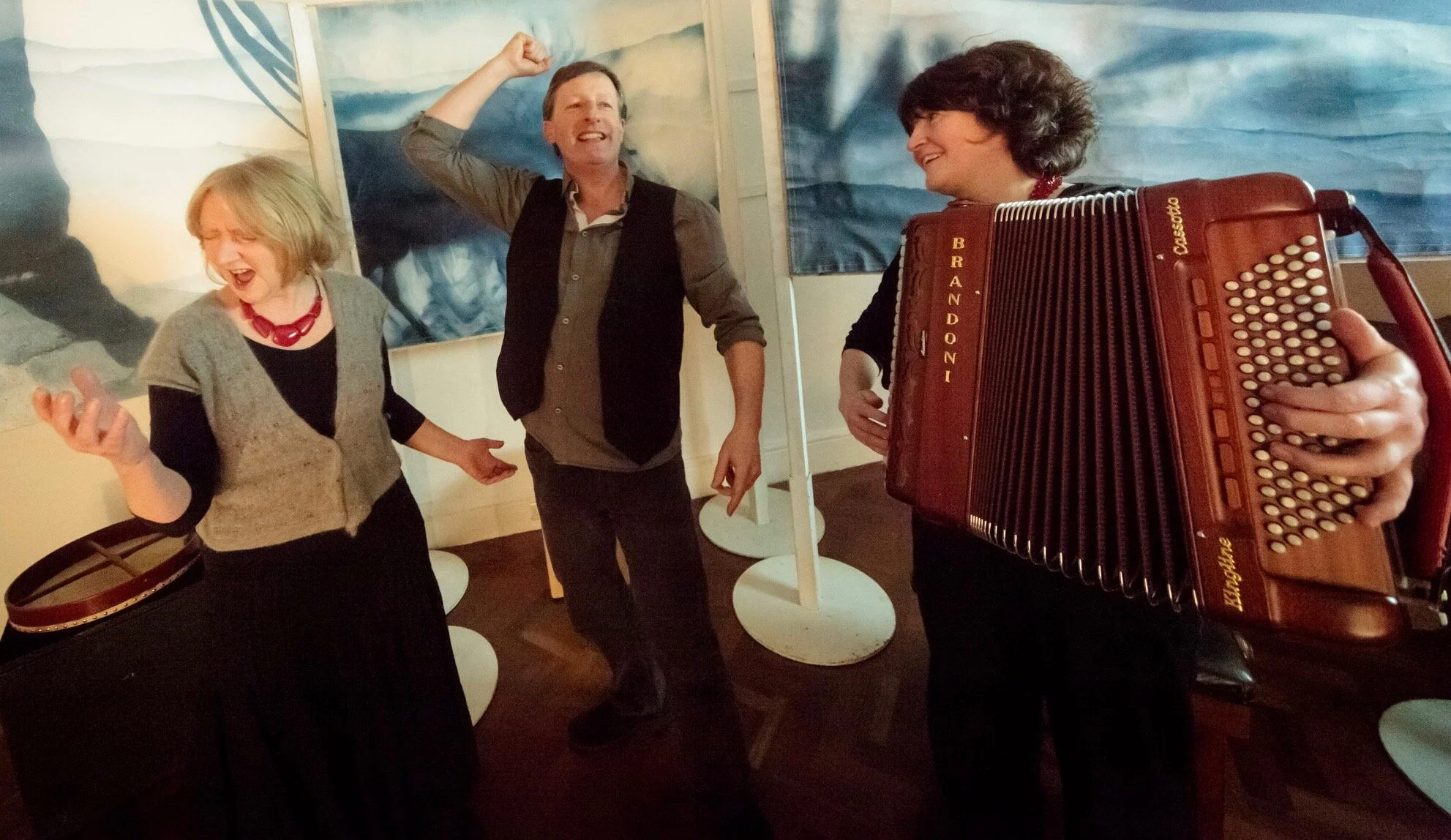 The photo above is me and my friends Lynne and Stacey. They also go under the name of the folk group Ffynnon. I’m not sure what is going on in this picture but I think it might be one of the really scary bits. Probably the one where the giant’s servants lever open his eyes with enormous forked sticks. Then he throws a stone-tipped, poisoned spear at Pig Boy and his friends. This should have skewered them all to the castle wall but luckily they escaped, thanks to their quick wits and daring